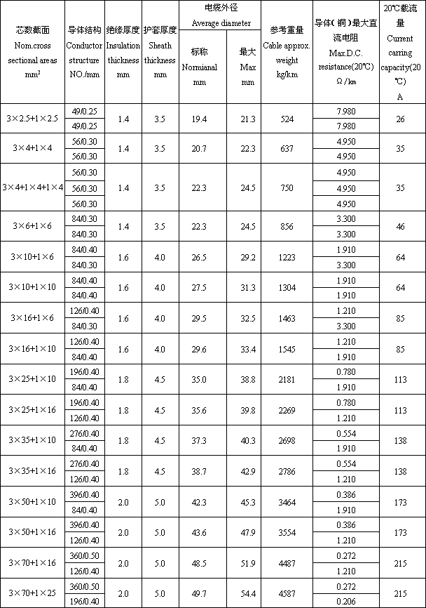 產(chǎn)品標(biāo)準(zhǔn)standard 本產(chǎn)品按GB12972-1991《礦用橡套軟電纜》、MT818-1999《煤礦用阻燃電纜》及Q/320282DCE037-2003標(biāo)準(zhǔn)生產(chǎn),同時(shí)還可根據(jù)用戶(hù)需要按國(guó)際電工委員會(huì)推薦標(biāo)準(zhǔn)IEC、英國(guó)標(biāo)準(zhǔn)、德國(guó)標(biāo)準(zhǔn)及美國(guó)標(biāo)準(zhǔn)生產(chǎn)。 The product is manufactured according to the standard 《Flexible rubber-sheathed cables for mining purposes》of GB12972-1991,《Flame retardant drade flexible rubber-sheathed cables for mining purposes》of MT818-1999, and Q/320282DCE037-2003, and the same time is also manufactured according to the standard of IEC、English、Germany and America. 適用范圍Applications 礦用橡套軟電纜適用于工頻額定電壓U0/U660/1140V及以下礦用動(dòng)力裝置用移動(dòng)敷設(shè)的電纜。 Flexible rubber-sheathed cables for mining purposes of suitable for mining purposes power device with moving installation and rated voltage up to and including 660/1140V. 使用特性O(shè)perating characteristics ● 工頻額定電壓U0/U為380/660V、660/1140V。 Rated power-frequency voltage U0/U:380/660V and 660/1140V。 ● 電纜導(dǎo)體的高允許工作溫度:65℃ Max. admissible operating temperature of the conductor:65℃ ● 電纜允許低的工作環(huán)境溫度為-35℃ Permissible long-term operating temperature: Lowest working temperature is :-35℃ ● 電纜彎曲半徑:The bending radius of cable D≤25mm.: ≥4D D>25mm.: ≥6D (D—Diameter of the cable). |